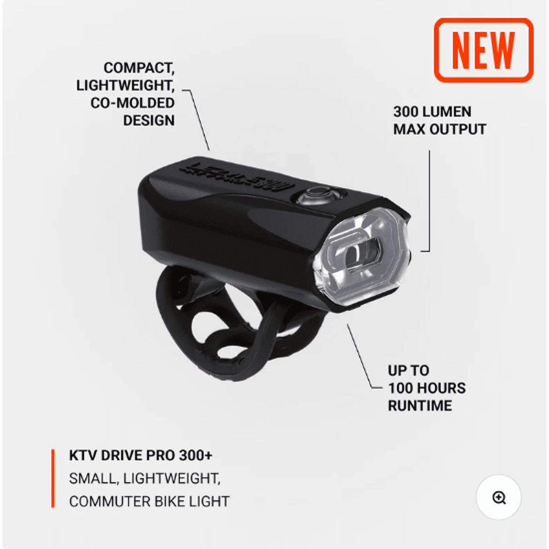 Lampe de sécurité compacte pour cyclistes construite autour de trois émetteurs LED à haut rendement, la lampe avant KTV Drive Pro 300+ offre jusqu’à 300 lumens de puissance et un mode de flash diurne très perturbateur.